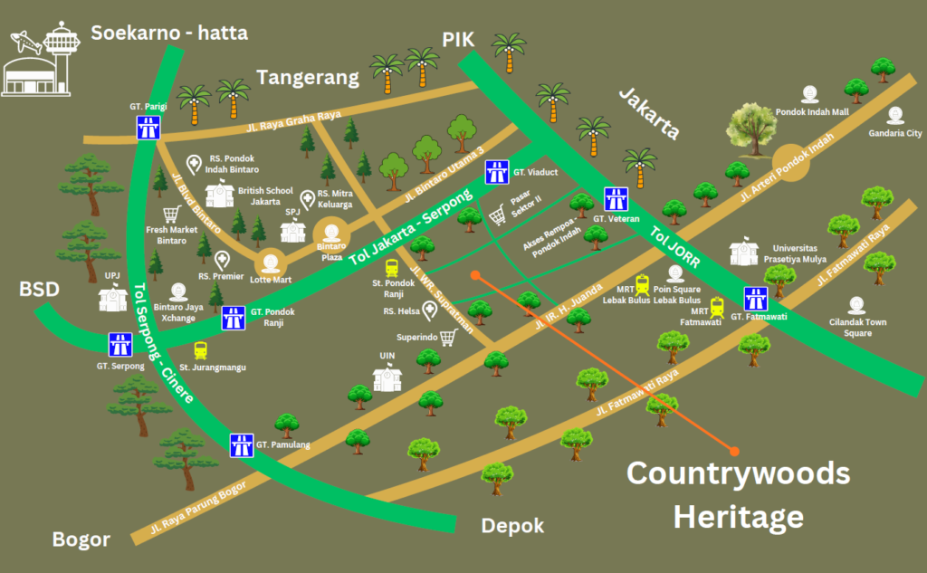 Konektivitas Tanpa Batas Kami memahami berharganya waktu Anda. Terletak strategis dengan akses mudah menuju Stasiun Pondok Ranji dan rute MRT Fase 3 mendatang, Countrywoods menawarkan mobilitas yang lancar dan efisien menuju pusat kota Jakarta. Kami memberikan solusi bagi mereka yang mencari keseimbangan antara gaya hidup dinamis dan ketenangan hunian.